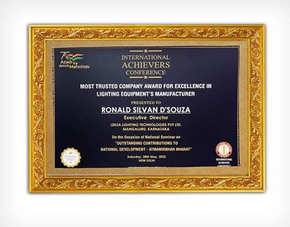 Most Trusted Company Award For Excellence in Lighting Equipment’s Manufacturer on occasion of National Seminar on “Outstanding Contributions to National Development 2022 – ATMANIRBHAR BHARAT”
